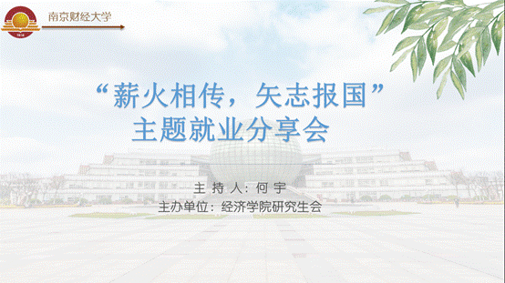 本次活动邀请到17级西方经济学的丁柏超、陈伟和18级应用统计的张振宇三位毕业班研究生,他们分别在求职、考博和就业方面取得了较为突出的成绩。活动过程中,丁柏超同学从职业方向选择、简历投递、笔试准备与面试发挥等方面讲述了自身的求职经历,并积极鼓励研究生同学们在一次次面试过程中积累发散性思维、培养严密的逻辑体系,也要提高语言表达能力,以期更好地回答面试官的问题。陈伟同学分享了考取上海财经大学博士生的经验,强调了研究生期间作出良好成果对于后期学校选择的重要性,他认为扎实的专业基础知识、高效的时间管理计划与良好的身体素质是使自身在竞争中脱颖而出的关键原因。张振宇同学分析了必赢官网研究生历年的就业趋势,又详细从公务员的备考安排、资料准备与面试经验等角度启发同学们如何把握当下机会,作出适合自己的选择。