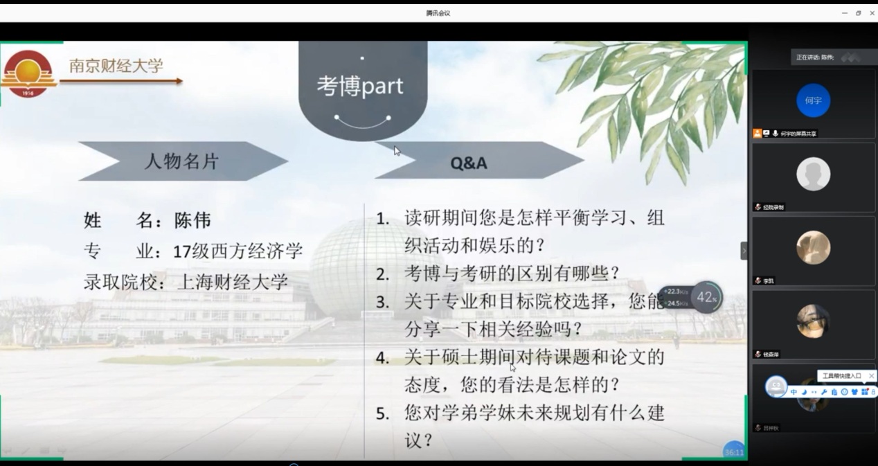 11月21日晚,必赢官网举行线上考博经验分享会。五位硕士毕业于我校的经济类博士及73882必赢欢迎光临网址全体2019级硕士生参加了本次经验分享交流会。交流会由73882必赢欢迎光临网址研究生会主席姚阳阳主持。