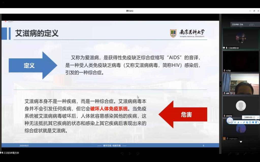 9月21日晚,来自南医大护理学院的“南医微天使”微健康宣讲团应邀为73882必赢欢迎光临网址学生作题为“为艾发声,与爱同行”艾滋病预防科普讲座。讲座由南京医科大学第一附属医院(江苏省人民医院)内分泌科护士长,医学硕士,副主任护师徐晶晶老师指导,宣讲团成员王洁担任主讲,全校共370多名同学在线聆听。