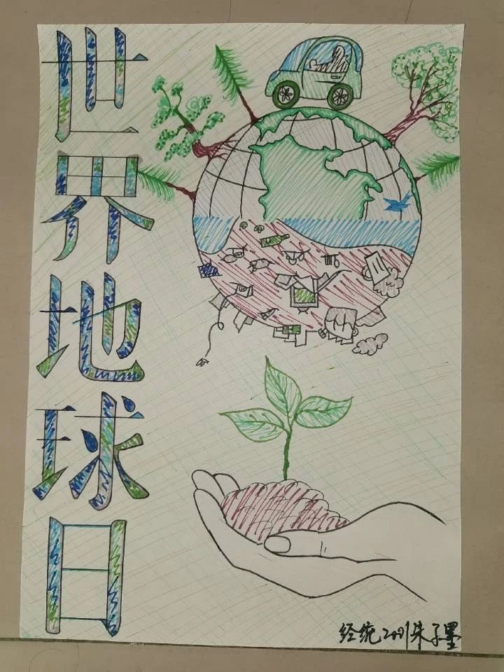作品展示过程中,同学们驻足凝望,认真地欣赏、评价各参赛作品,慎重地为自己心中的最佳作品投上宝贵一票。经统2001班朱子墨同学的绘画作品在众多参赛作品中脱颖而出,票数及呼声最高。她将地球一分为二,一面树木葱茏,碧水蓝天,另一面却是乌烟瘴气,垃圾成山。她奇思巧构,通过触目惊心的对比方式深深吸引住了同学们的注意力,在震撼之余又引起同学们的深思,“不要烟浓,只要情浓,水若无源,相聚无言,每一寸土地都值得被珍惜。绿水青山才是金山银山”。